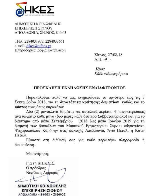 ΠΡΟΣΚΛΗΣΗ ΕΚΔΗΛΩΣΗΣ ΕΝΔΙΑΦΕΡΟΝΤΟΣ ΓΙΑ ΕΝΟΙΚΙΑΣΗ ΔΩΜΑΤΙΩΝ ΤΩΝ ΔΑΣΚΑΛΩΝ ΤΟΥ ΜΟΥΣΙΚΟΥ ΕΡΓΑΣΤΗΡΙΟΥ ΣΙΦΝΟΥ