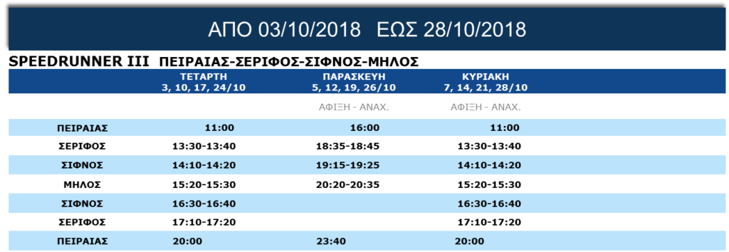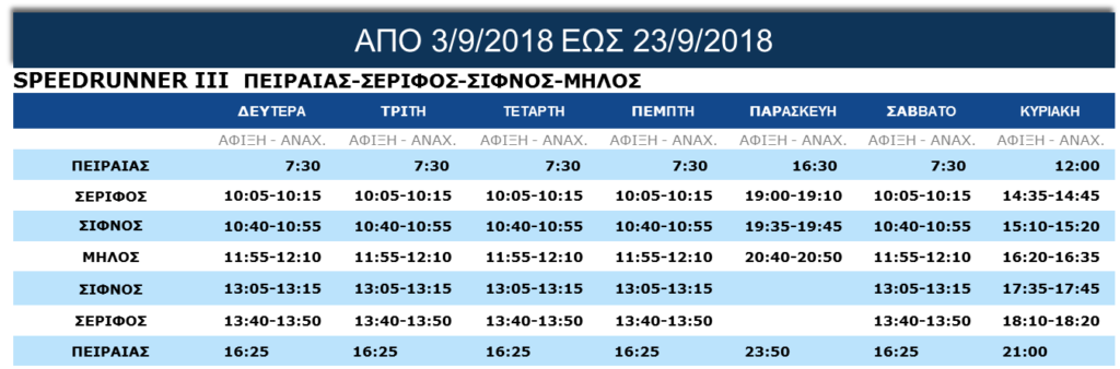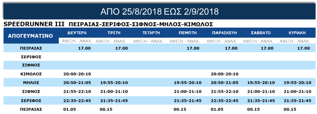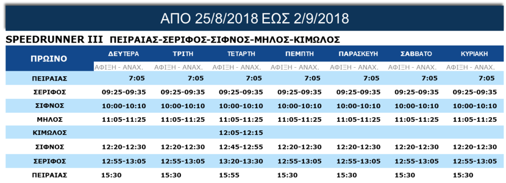 Το SPEEDRUNNER3 σταματάει τα διπλά δρομολόγια την Κυριακή 2 Σεπτεμβρίου αφού απο την Κυριακή 25 Αυγούστου στο απογευματινό δρομολόγιο το πρώτο νησί θα είναι η Κίμωλος ή η Μήλος αντί της Σερίφου.Απο 3 Σεπτέμβρη θα έχει ενα την ημέρα και όπως δείχνουν οι παρακάτω πίνακες θα λιγοστεύουν σταδιακά μέχρι 28 Οκτωβρίου που θα είναι το τελευταίο.