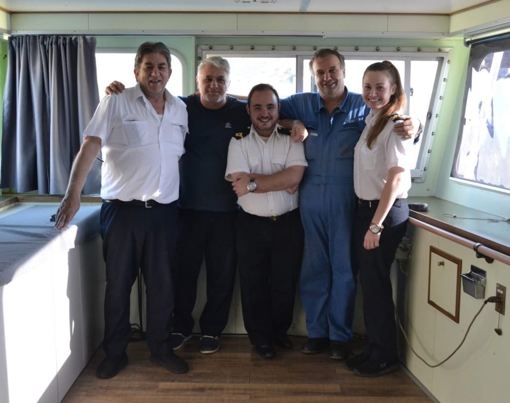 Από αριστερά προς τα δεξιά βλέπουμε τον ανθυποπλοίαρχο καπετάν-Δημήτρη Νικολάκη, τον καπετάνιο του πλοίου καπετάν-Μιχάλη Λυγνό, τον δόκιμο καπετάν-Σαράντο Οικονομόπουλο, τον Α’ Μηχανικό μαστρο-Γιάννη Ζούρα και την ανθυποπλοίαρχο καπετάνισα-Κατερίνα Παπαποστόλου.