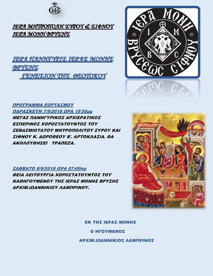 ΠΡΟΓΡΑΜΜΑ ΕΟΡΤΑΣΜΟΥ ΙΕΡΑΣ ΜΟΝΗΣ ΒΡΥΣΗΣ ΣΙΦΝΟΥ 7 ΚΑΙ 8 ΣΕΠΤΕΜΒΡΙΟΥ