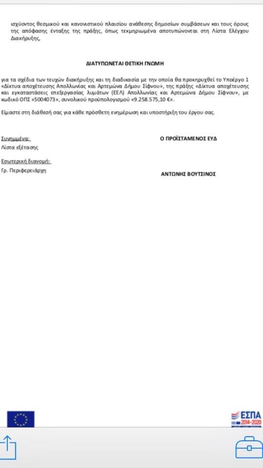 Συγκεκριμένα, εγκρίθηκαν απο την Ειδική Υπηρεσια Διαχείρισης της Περιφέρειας Νοτίου Αιγαιου τα σχέδια των τευχών δημοπράτησης του Υποέργου 1 που αφορά στα “Δικτυα Αποχέτευσης Απολλωνιας και Αρτεμωνα Δημου Σιφνου”.