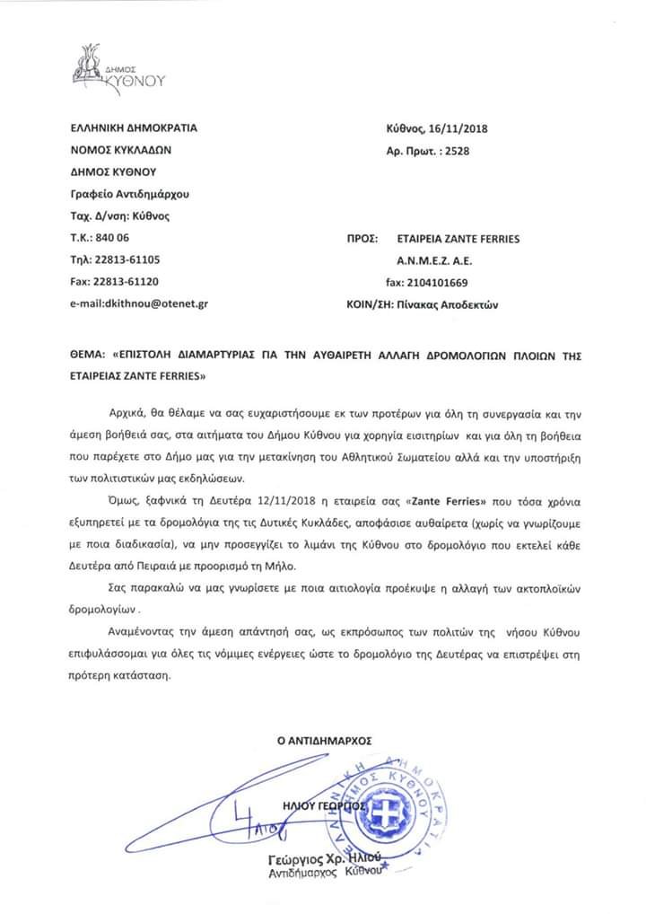 Απο την προηγούμενη Δευτέρα το ΑΔΑΜΑΝΤΙΟΣ ΚΟΡΑΗΣ στην αναχώρηση του απο Πειραιά με τελικό προορισμό την Σαντορίνη, έβγαλε εκτός το λιμάνι της Κυθνου στην κάθοδο,ενω στην άνοδο την Τρίτη θα περνάει κανονικά απο Κύθνο. Η κίνηση αυτή ευχαρίστησε τους κατοίκους των άλλων νησιών αφού κερδίζουν χρόνο από το ταξίδι τους,αλλά δυσαρεστησε τους κατοίκους της Κυθνου με αποτέλεσμα ο Δήμος να διαμαρτυρηθεί με την παρακάτω επιστολή: