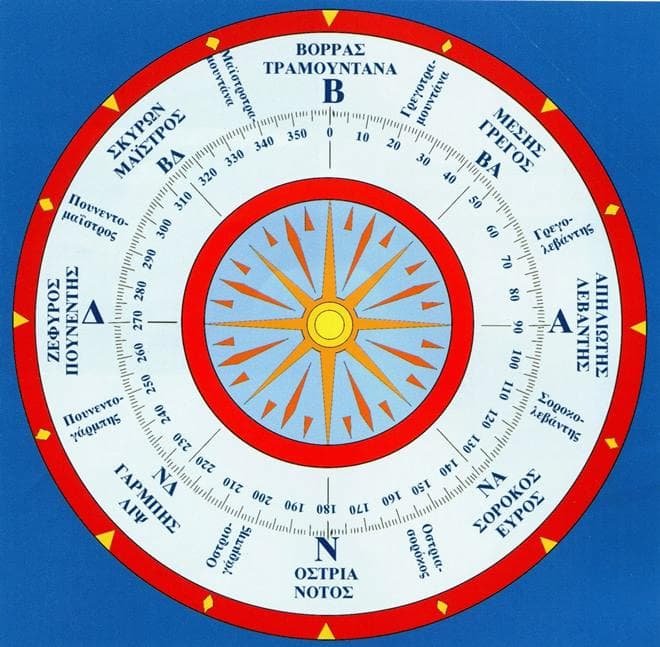 Ανεμολόγιο. Η διεύθυνση και η ονομασία των ανέμων. Πρόκειται για τον χάρτινο δίσκο που αναπαριστά τον ορίζοντα και η περιφέρεια του υποδιαιρείται από 0° έως 360°.