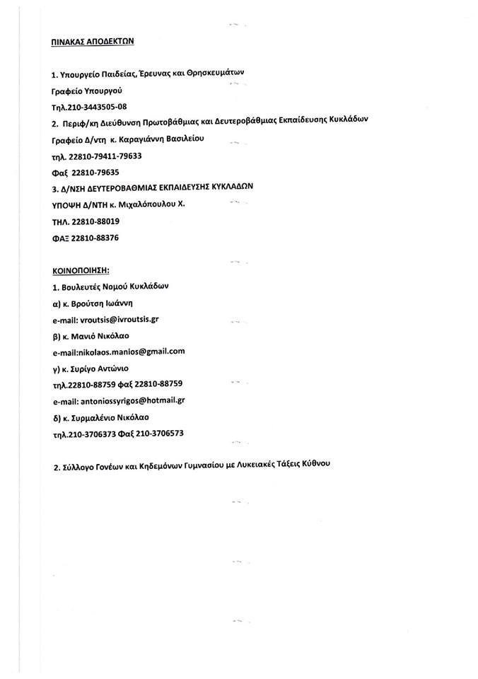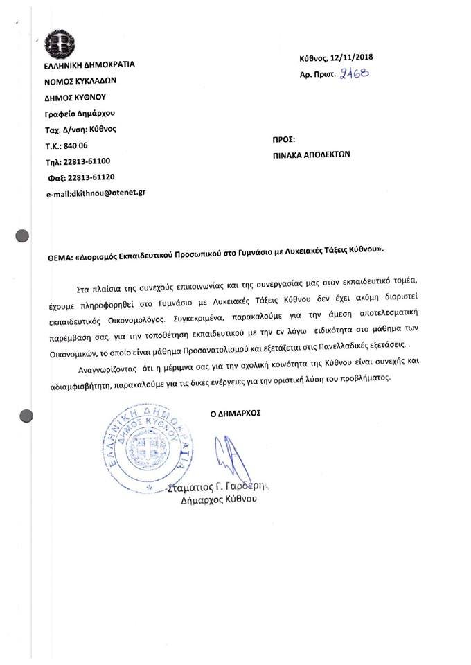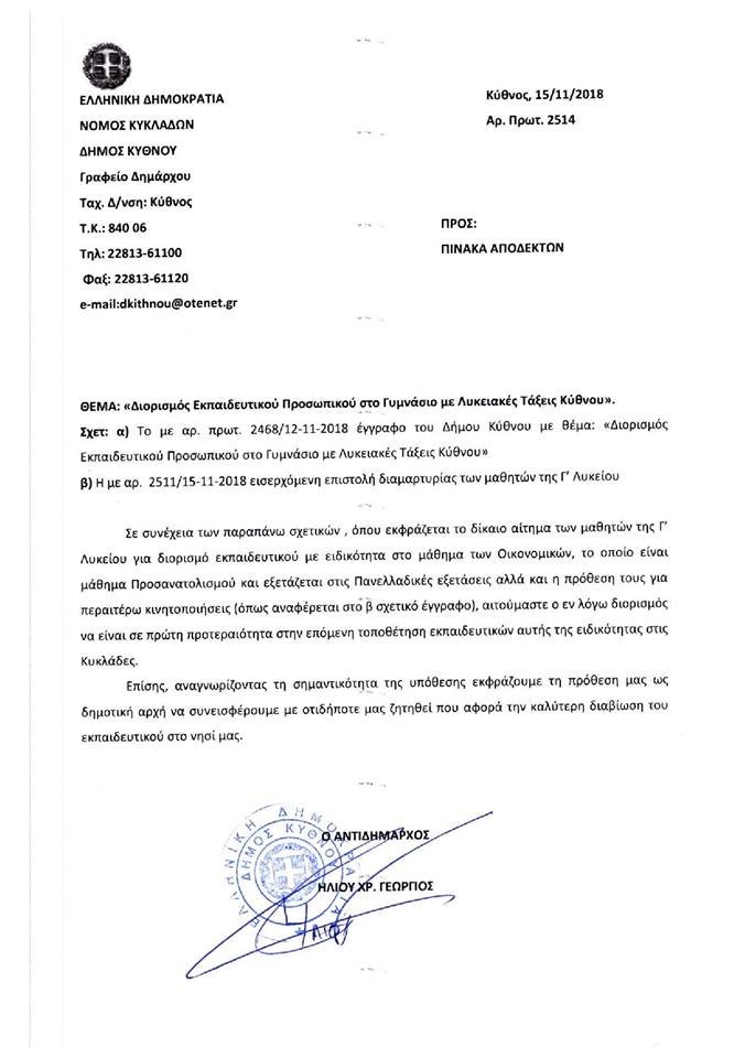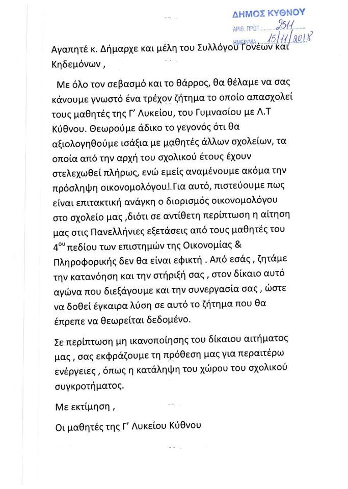 ΕΠΙΣΤΟΛΕΣ ΔΙΑΜΑΡΤΥΡΙΑΣ ΤΟΥ ΔΗΜΟΥ ΚΥΘΝΟΥ ΓΙΑ ΕΛΛΕΙΨΗ ΕΚΠΑΙΔΕΥΤΙΚΟΥ