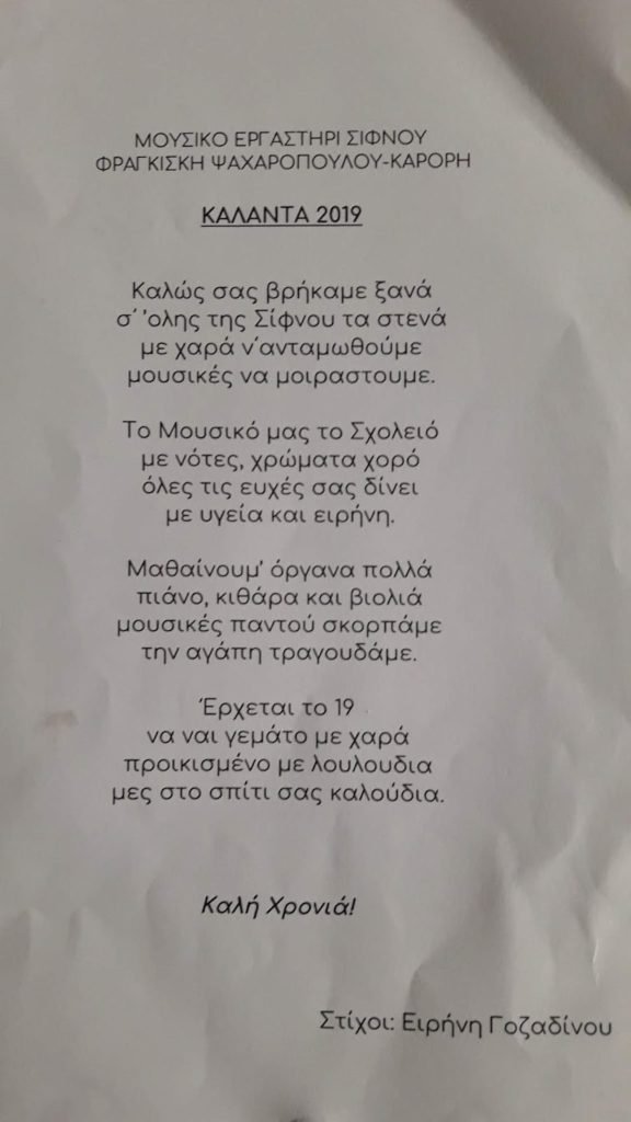 Σήμερα το πρωί τα παιδιά του Μουσικου εργαστηρίου Σιφνου ”ΦΡΑΓΚΙΣΚΗ ΨΑΧΑΡΟΠΟΥΛΟΥ ΚΑΡΟΡΗ”επισκέφθηκαν το λιμάνι της Σίφνου και πήγαν σε ολα τα σπιτια να πουνε τα κάλαντα όπως κάνουν κάθε χρόνο.