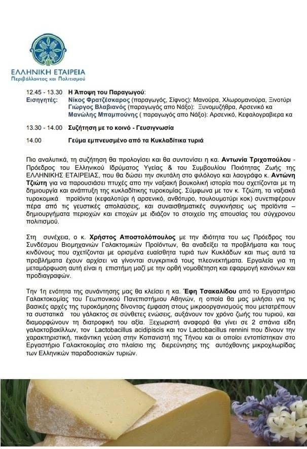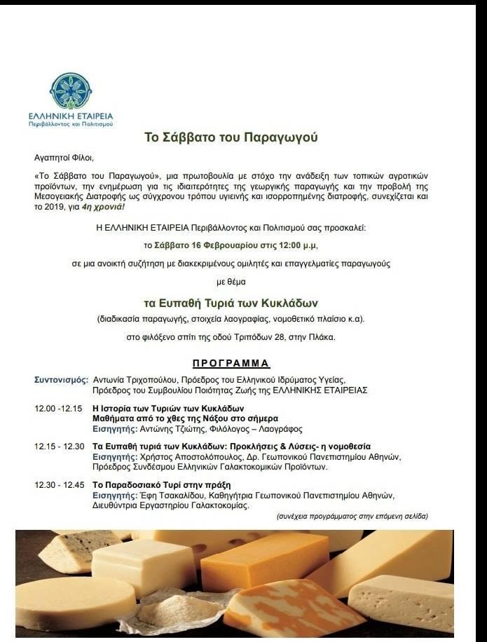 Η ΕΛΛΗΝΙΚΗ ΕΤΑΙΡΕΙΑ Περιβάλλοντος και Πολιτισμού σας προσκαλεί: το Σάββατο 16 Φεβρουαρίου στις 12:00 μ.μ, σε μια ανοικτή συζήτηση με διακεκριμένους ομιλητές και επαγγελματίες παραγωγούς με θέμα Τα Ευπαθή Τυριά των Κυκλάδων (διαδικασία παραγωγής, στοιχεία λαογραφίας, νομοθετικό πλαίσιο κ.α). στο φιλόξενο σπίτι της οδού Τριπόδων 28, στην Πλάκα.