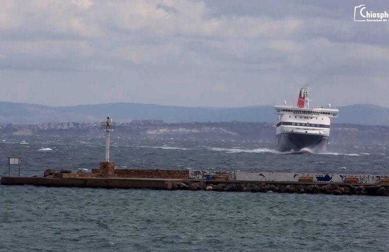 Τη μάχη του πλοίου «Νήσος Μύκονος» που εκτελεί την άγονη γραμμή του Βορείου Αιγαίου καθώς και τη μανούβρα που έκανε κόντρα στα κύματα και τον θυελλώδη βοριά για να μπει στο λιμάνι της Χίου κατέγραψε ο φακός του Κώστα Αναγνώστου και του Chiosphotos.gr.