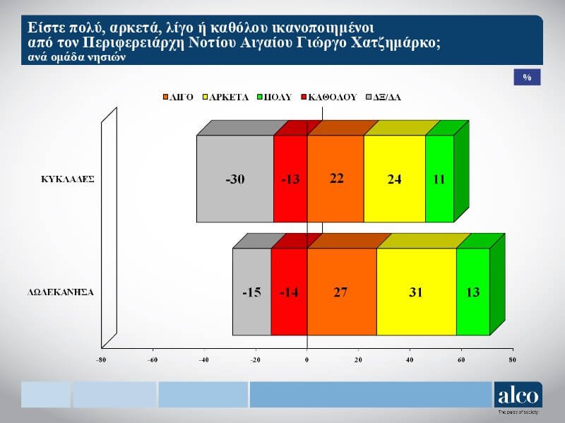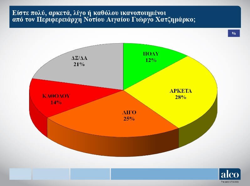 Το πρώτο ερώτημα που διατυπώθηκε ήταν το κατά πόσο ικανοποιημένοι είναι οι ερωτώμενοι από τον νυν Περιφερειάρχη και εκ νέου υποψήφιο, Γιώργο Χατζημάρκο. Πολύ και αρκετά απάντησε το 40% (12% και 28% αντίστοιχα), ενώ λίγο και καθόλου το 39% (25% και 14% αντίστοιχα).