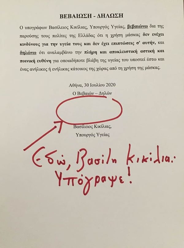 Όταν υπογράψεις τη βεβαίωση-δήλωση, εγώ πρώτη θα φορέσω την άλλη στιγμή τη μάσκα.