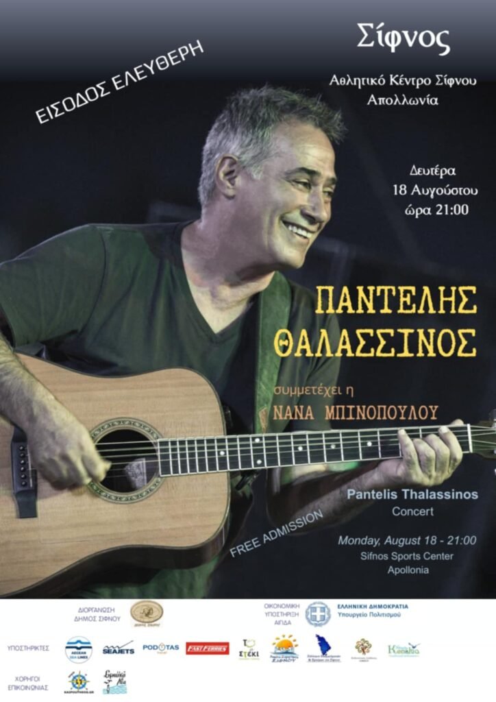 Στην Απολλωνία της Σίφνου στο αθλητικό κέντρο της Μαρούσας θα τραγουδήσει την Δευτέρα 18 Αυγούστου στις 21:00 με ελεύθερη είσοδο ο δημοφιλής τραγουδιστής Παντελής Θαλασσινός.