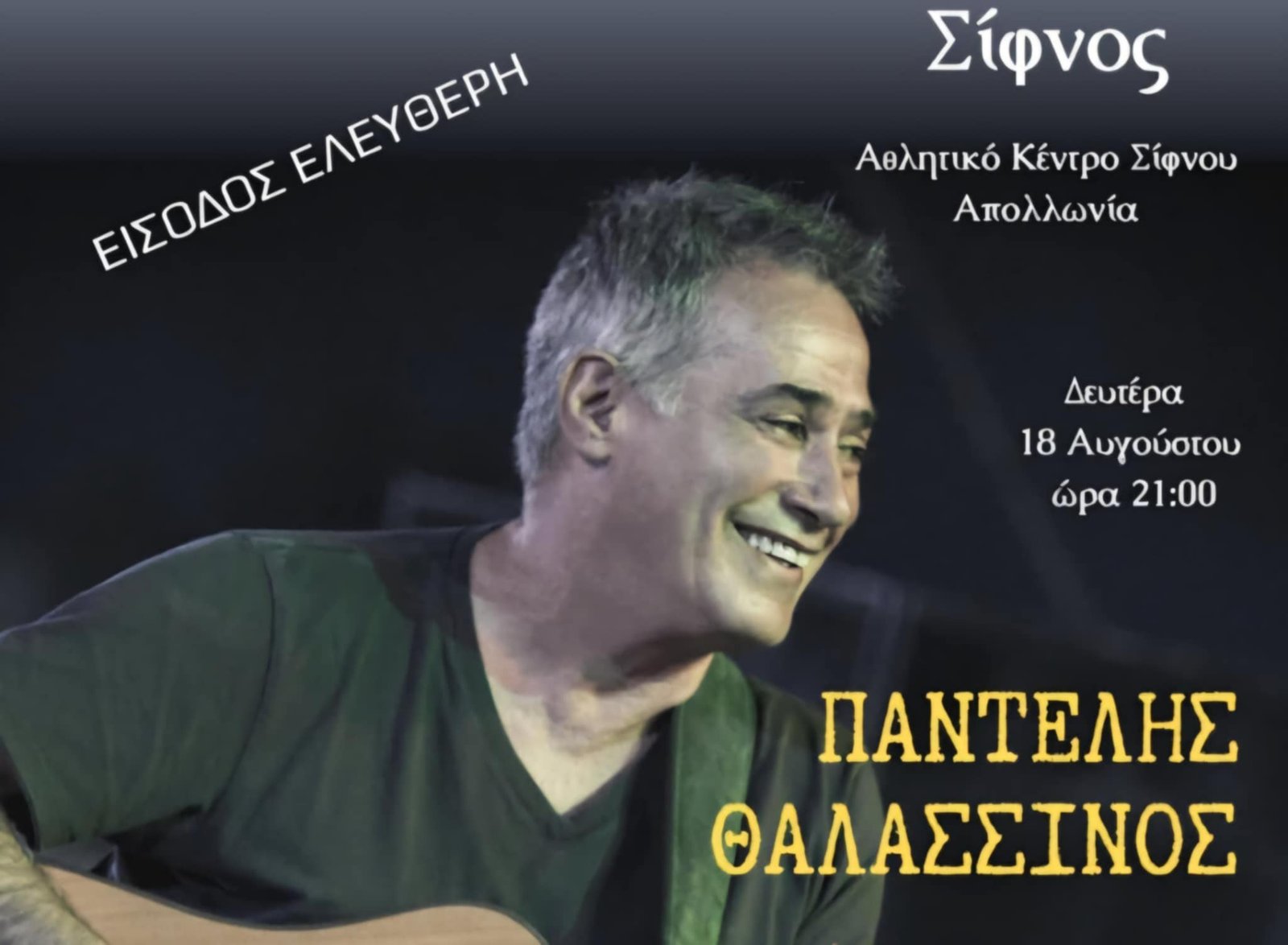 Στην Απολλωνία της Σίφνου στο αθλητικό κέντρο της Μαρούσας θα τραγουδήσει την Δευτέρα 18 Αυγούστου στις 21:00 με ελεύθερη είσοδο ο δημοφιλής τραγουδιστής Παντελής Θαλασσινός.