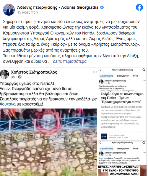 Σύμφωνα με τον Άδωνι Γεωργιάδη, στις αναρτήσεις χρησιμοποιήθηκε φωτογραφία από τον άγριο ξυλοδαρμό υπουργού Οικονομικών στο Νεπάλ. «Ξεσάλωσαν λογαριασμοί της Άκρας Αριστεράς αλλά και της Άκρας Δεξιάς», σχολίασε σε δική του ανάρτηση στο Facebook.