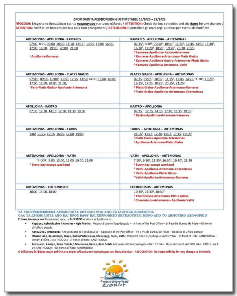 Δρομολόγια λεωφορείων Σίφνου από 15 έως 28/9/2025