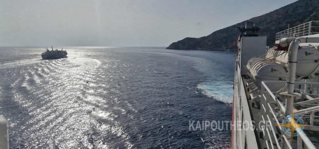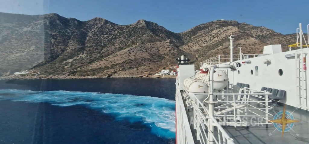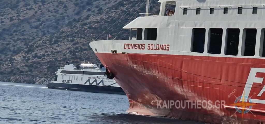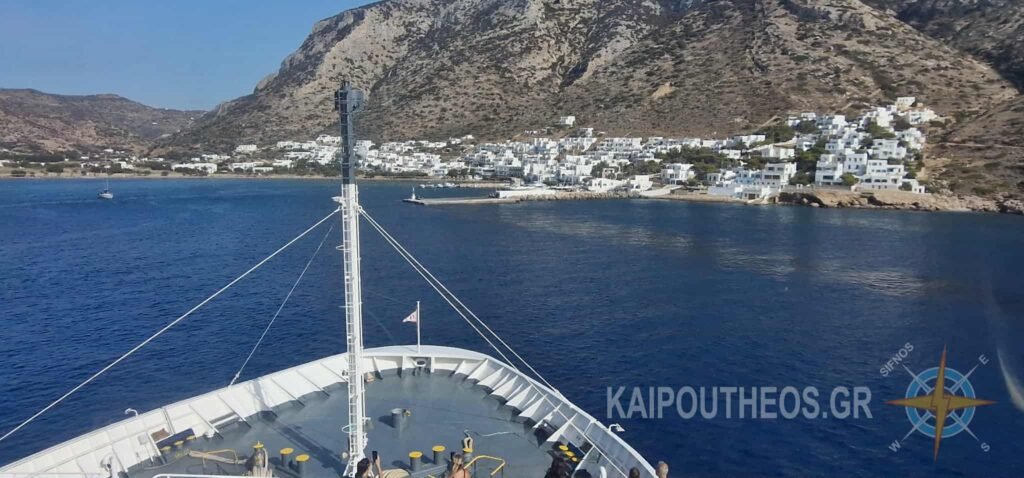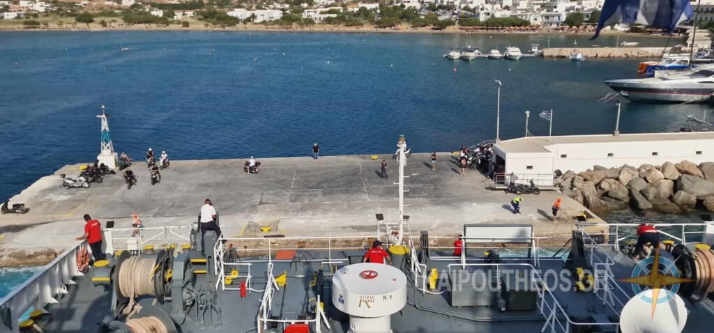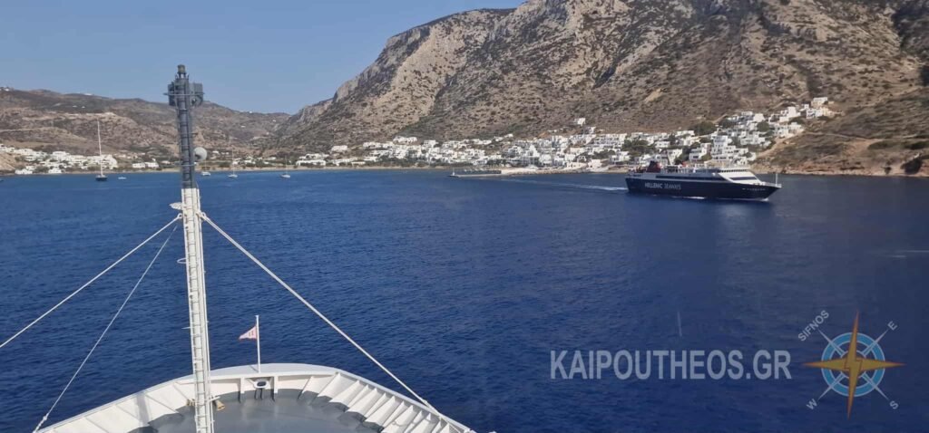 Το πλοίο δένει στον μόλο και φορτώνει για Σέριφο και Πειραιά, ενώ ήδη έχει φτάσει στο λιμάνι και το ταχύπλοο της seajets OLYMPIC CHAMPION JET και περιμένει την σειρά του για να δέσει.