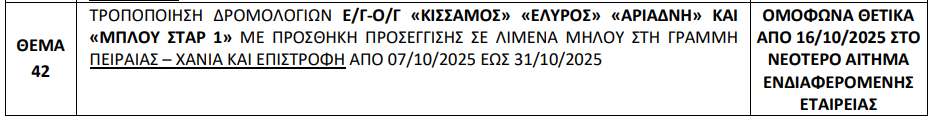 «ΜΠΛΟΥ ΣΤΑΡ 1» ΜΕ ΠΡΟΣΘΗΚΗ ΠΡΟΣΕΓΓΙΣΗΣ ΣΕ ΛΙΜΕΝΑ ΜΗΛΟΥ ΣΤΗ ΓΡΑΜΜΗ ΠΕΙΡΑΙΑΣ – ΧΑΝΙΑ ΚΑΙ ΕΠΙΣΤΡΟΦΗ ΑΠΟ 07/10/2025 ΕΩΣ 31/10/2025″, και σύμφωνα με νεότερο αίτημα της εταιρείας ζητείται έναρξη προσεγγίσεων στις 16/10/2025.