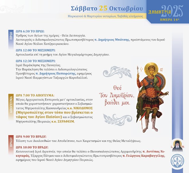Η Ενορία μας θα αναμένει το μεγάλο πλήθος των ενοριτών και ευλαβών προσκυνητών από διάφορες περιοχές του λεκανοπεδίου Αττικής για να προσκυνήσουν την Ιερά Εικόνα της Παναγίας της Χρυσοπηγής από το νησί της Σίφνου, που φέτος λαμπρύνει τις εορταστικές εκδηλώσεις “ΔΗΜΗΤΡΙΑ 2025”.