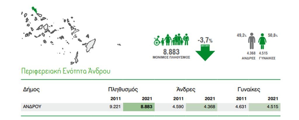 Από τις 8.883 κατοίκους της ΠΕ Άνδρου, οι άνδρες είναι 4.368 και οι γυναίκες είναι 4.515.