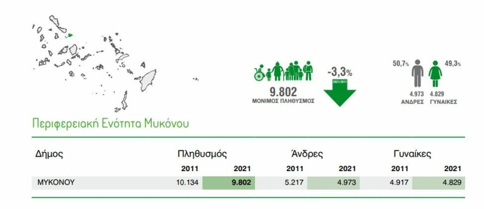 Από τις 9.802 κατοίκους της ΠΕ Μυκόνου, οι άνδρες είναι 4.973 και οι γυναίκες είναι 4.829.