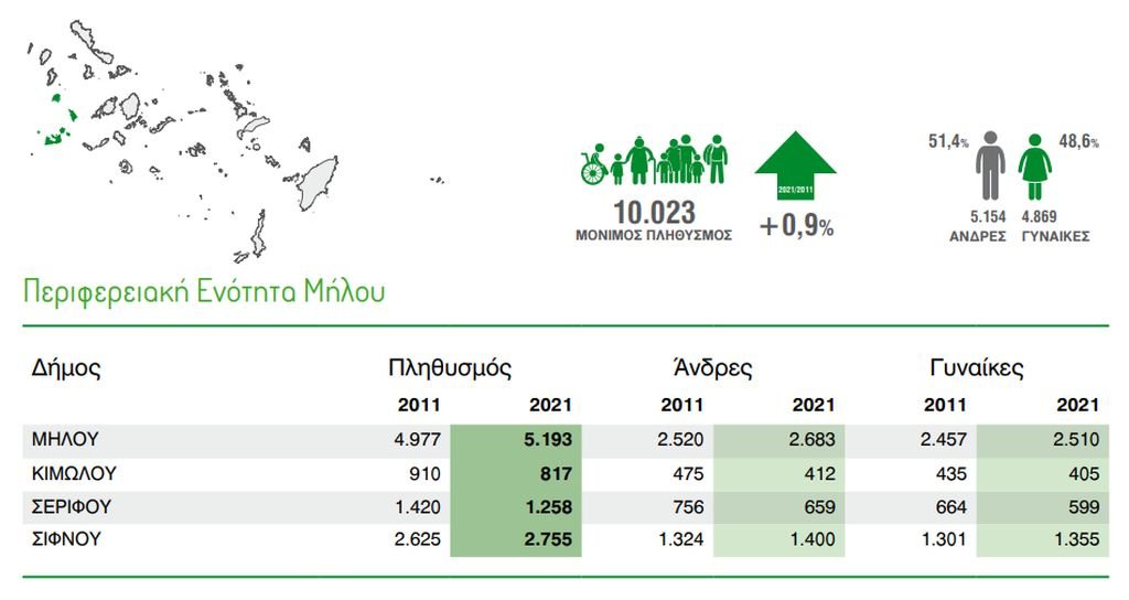 Από τις 10.023 κατοίκους της ΠΕ Μήλου, οι άνδρες είναι 5.145 και οι γυναίκες είναι 4.869.