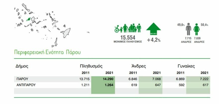Από τις 15.554 κατοίκους της ΠΕ Πάρου, οι άνδρες είναι 7.715 και οι γυναίκες είναι 7.839.