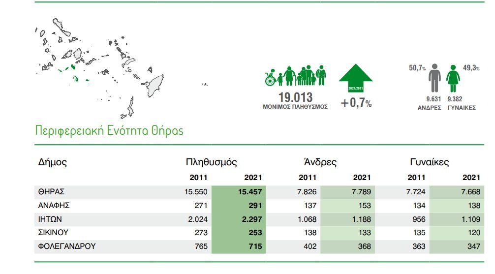 Από τις 19.013 κατοίκους της ΠΕ Θήρας, οι άνδρες είναι 9.631 και οι γυναίκες είναι 9.382.