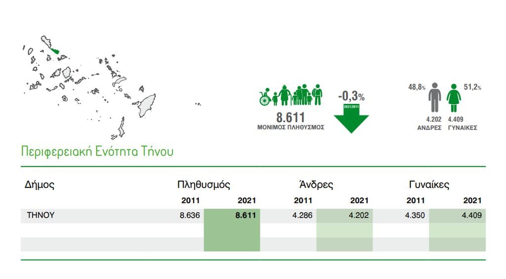 Από τις 8.611 κατοίκους της ΠΕ Τήνου, οι άνδρες είναι 4.202 και οι γυναίκες είναι 4.409.