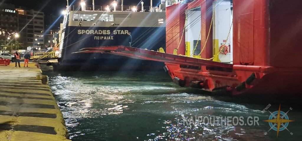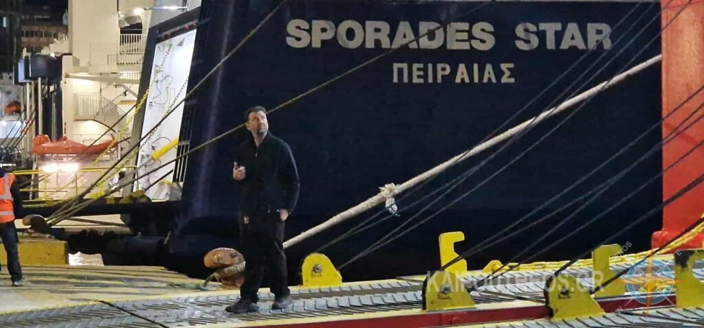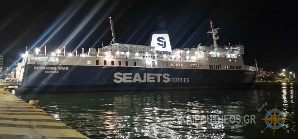 Το «SPORADES STAR” φθάνει και δένει στο λιμάνι με τον καπετάν-Διαμαντή Παπαγεωργίου στο τιμόνι.