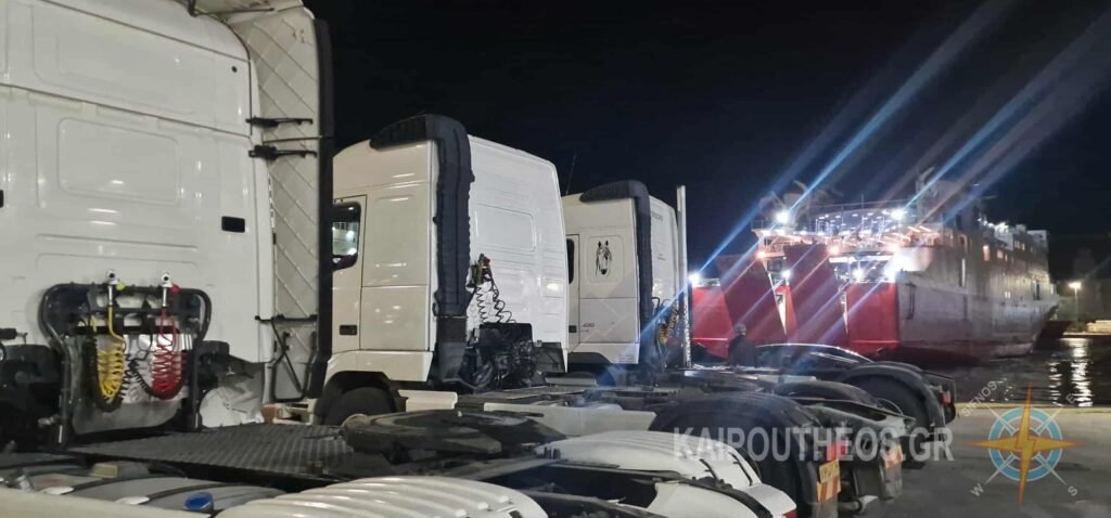 Στον μόλο περιμένουν οι οδηγοί με τους τράκτορες για την εκφόρτωση των φορτηγών.