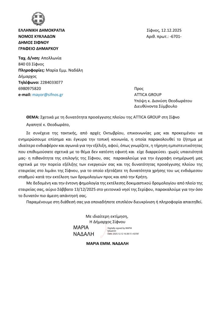 Σε συνέχεια της ενημέρωσής σας σχετικά με τη δυνατότητα προσέγγισης πλοίου της ATTICA GROUP στη Σίφνο, οφείλουμε, όπως πάντα, σε πνεύμα ειλικρίνειας απέναντί σας, να σας ενημερώσουμε για τις νεότερες εξελίξεις: