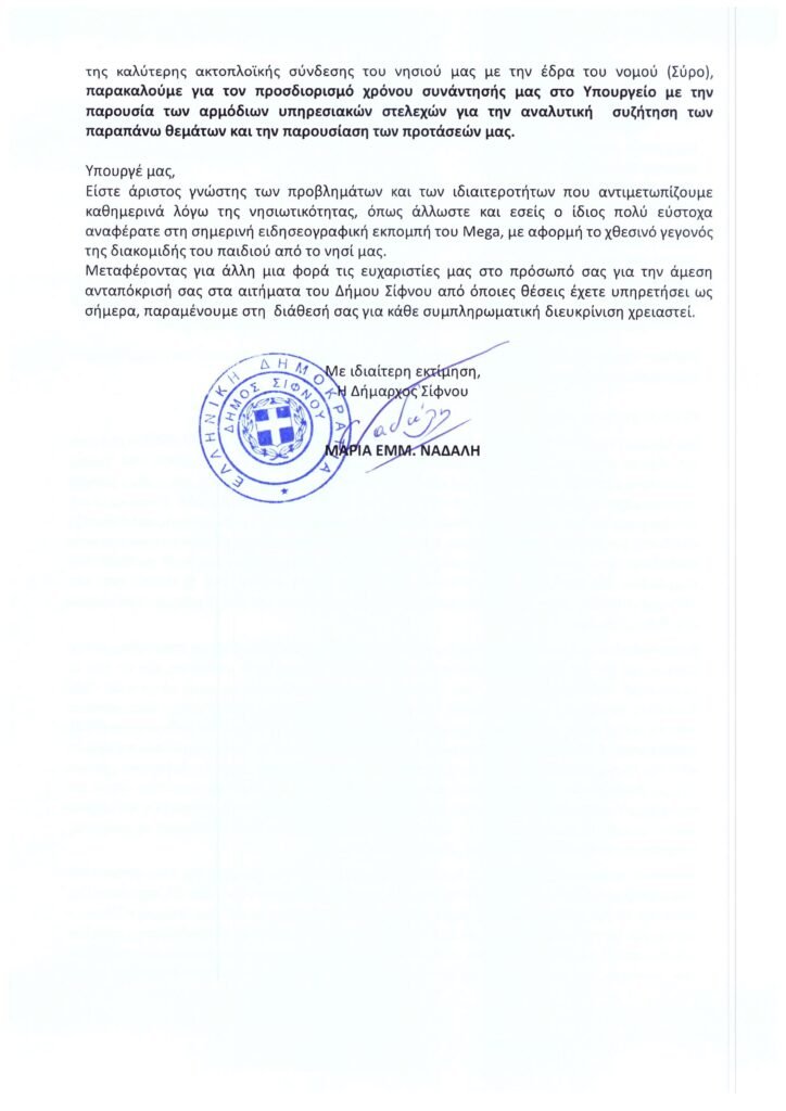 Ενημερώνουμε τους δημότες μας ότι για το σύνολο των προβλημάτων που αντιμετωπίζουμε ως προς την ακτοπλοϊκή σύνδεση της Σίφνου ειδικά κατά τους χειμερινούς μήνες, έχει προγραμματιστεί συνάντηση με τον Υπουργό Ναυτιλίας & Νησιωτικής Πολιτικής κ. Βασίλη Κικίλια εντός της επόμενης εβδομάδας.