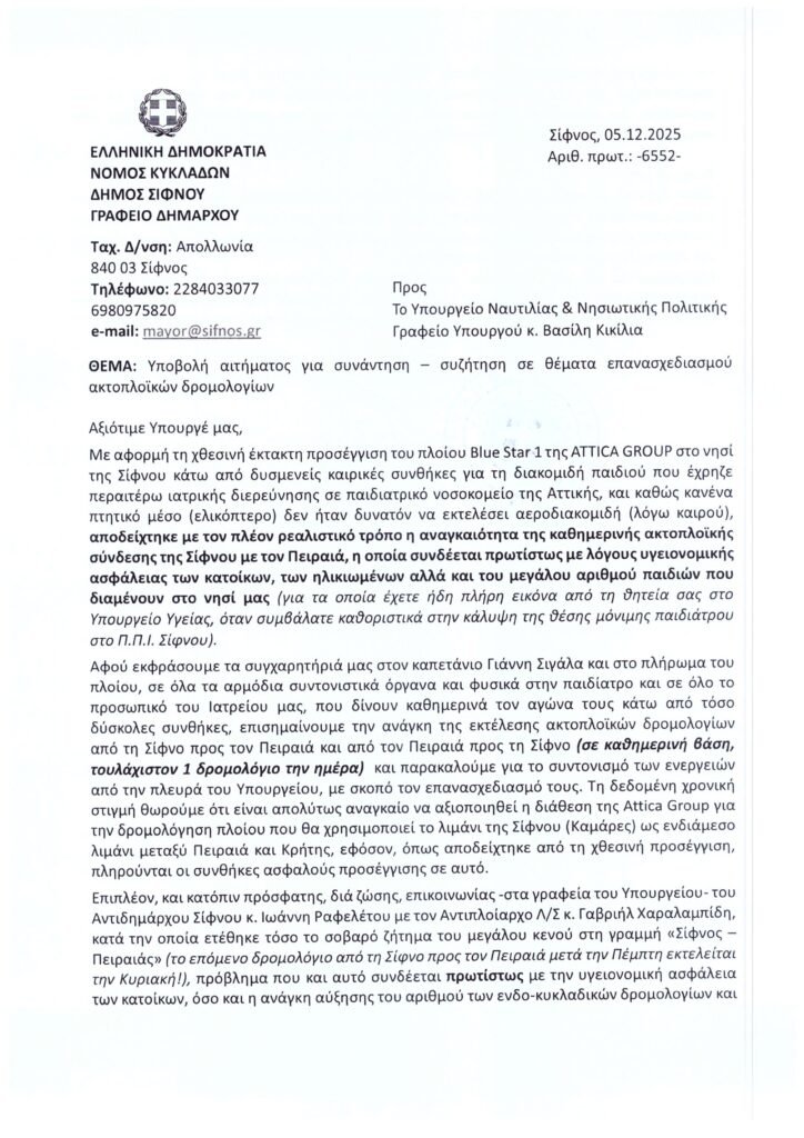 -Στις 5 Δεκεμβρίου, αμέσως μετά την προσέγγιση του πλοίου Blus Star I για τη διακομιδή μικρού παιδιού που έχρηζε περαιτέρω ιατρικής διερεύνησης σε παιδιατρικό νοσοκομείο, εστάλη στον Υπουργό Ναυτιλίας & Νησιωτικής Πολιτικής η υπ’ αρ. πρωτ.: 6552/05.12.2025 επιστολή μας.