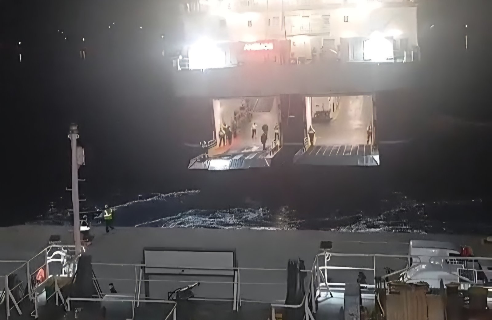 Πρώτο μπήκε στο λιμάνι το ΔΙΟΝΥΣΙΟΣ ΣΟΛΩΜΟΣ και έδεσε στην έξω πλευρά και ακολούθησε το ΑΝΕΜΟΣ που έδεσε στην μέσα πλευρά.