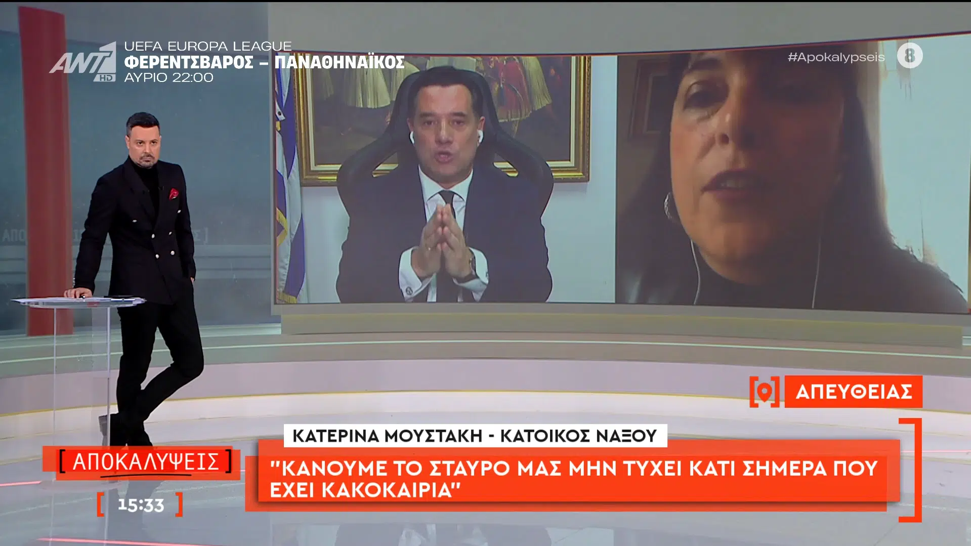 «Έχει δίκιο η κυρία που λέει οτι ο πατέρας της πήγε ασυνόδευτος. Η οικογένεια δεν ήθελε να νοσηλευτεί στη Νάξο. Η οικογένεια λέει οτι κακώς τον διακομίσαμε. Να πληρώσει τα έξοδα εφόσον ήθελε να πάει στη Σύρο.», σχολίασε ο Άδωνις Γεωργιάδης, γεγονός που οδήγησε την Κατερίνα Μουστάκη να παρέμεβι εκ νέου, με τη συζήτηση να “ανάβει” γρήγορα.