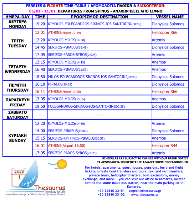 Αναχωρήσεις πλοίων και ελικοπτέρων από Σίφνο από 5 εως 11/1/26