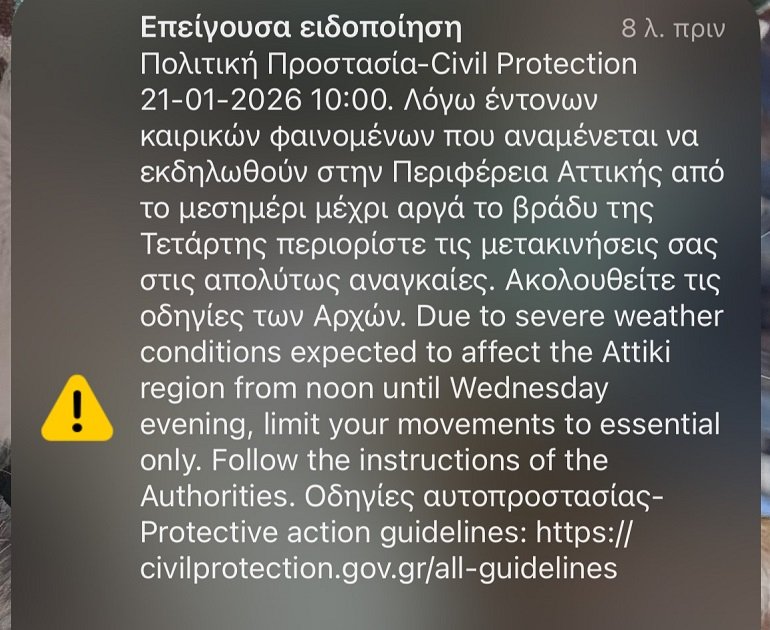 Μήνυμα από το 112 της Πολιτικής Προστασίας εστάλη στους κατοίκους της Αττικής προειδοποιώντας για τα έντονα καιρικά φαινόμενα που αναμένεται να εκδηλωθούν στην Περιφέρεια Αττικής.