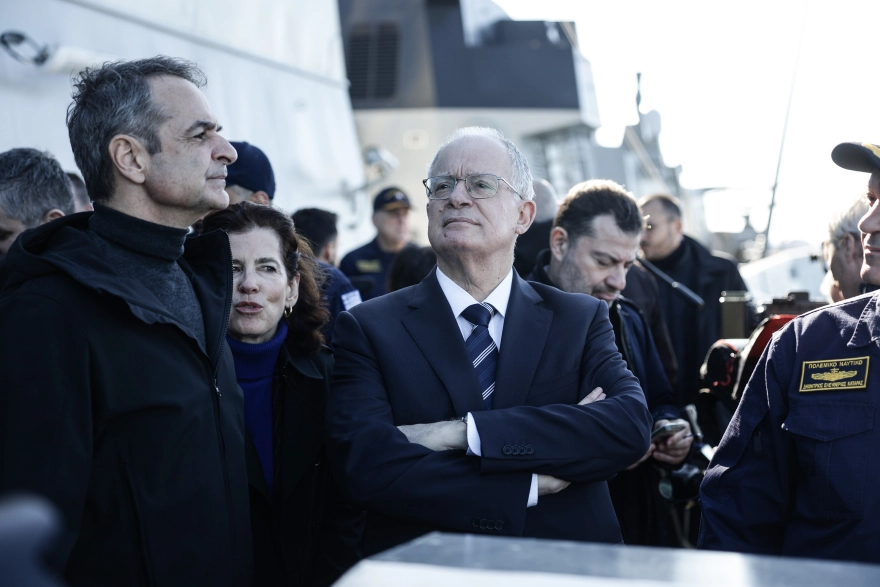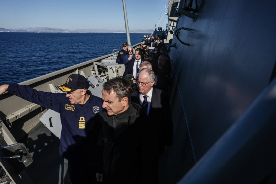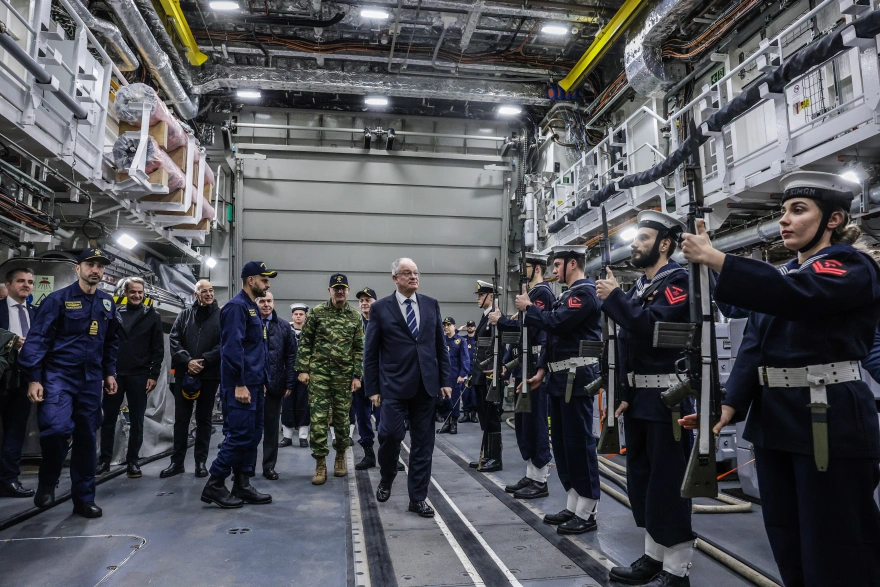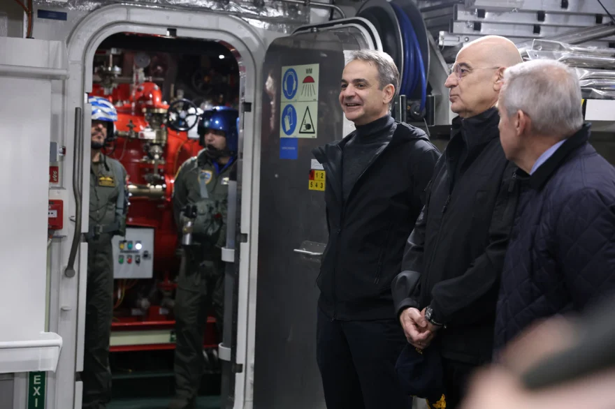 Ο πρόεδρος της Δημοκρατίας, Κωνσταντίνος Τασούλας, ο πρωθυπουργός, Κυριάκος Μητσοτάκης, και ο υπουργός Εθνικής Άμυνας, Νίκος Δένδιας, προσγειώθηκαν στη φρεγάτα Belharra, δίνοντας από την πρώτη στιγμή τον τόνο μιας τελετής με έντονο θεσμικό χαρακτήρα και σαφή πολιτική βαρύτητα.