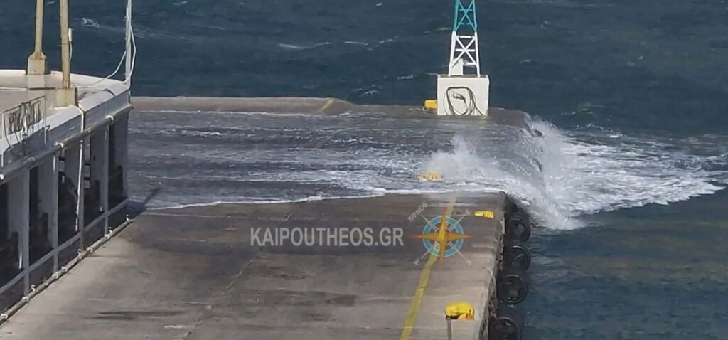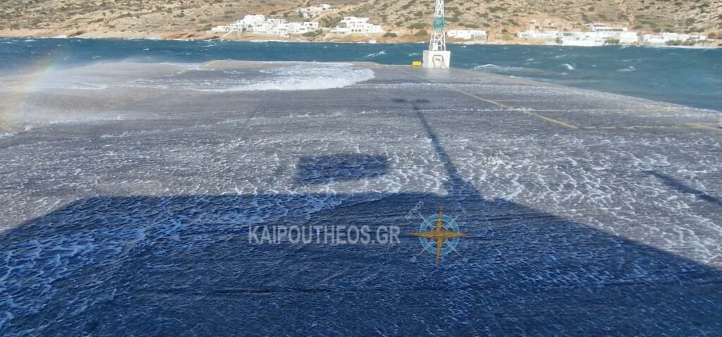 Στο βίντεο βλέπουμε πλάνα από το λιμάνι και τη Σπήλια με το νερό να ανεβαίνει από την πλευρά του μόλου και να φεύγει από την άλλη: