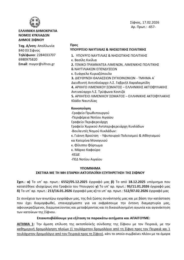 Ομόφωνα θετική ήταν η απόφαση του έκτακτου Δημοτικού Συμβουλίου της Δευτέρας 16/02/2026 με θέμα τον Ακτοπλοϊκό Αποκλεισμό της Σίφνου.
