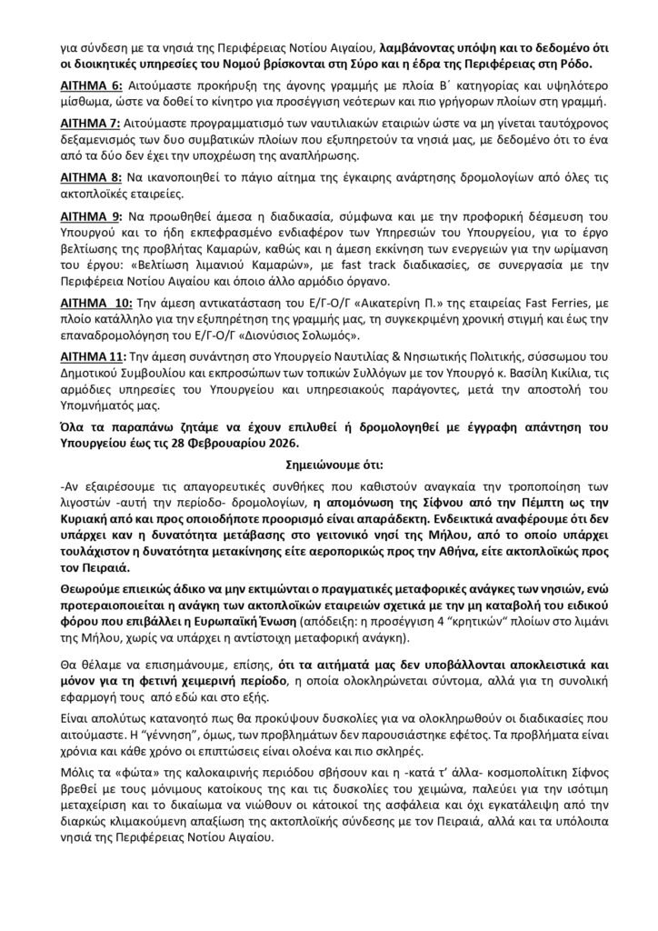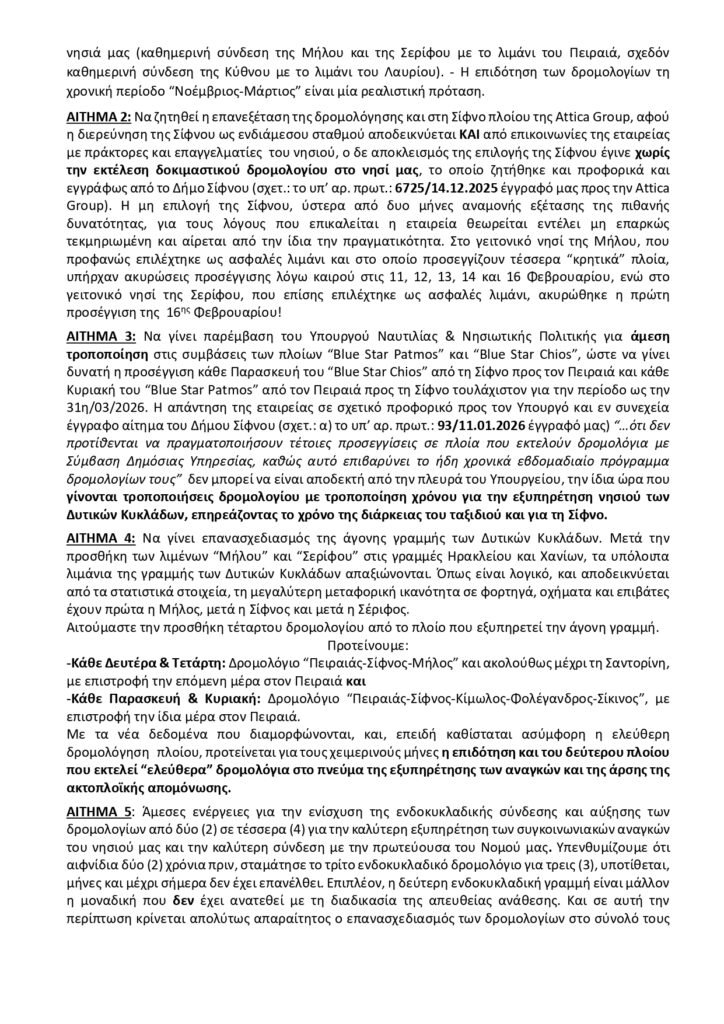 2. Παρέμβαση του Υπουργού Ναυτιλίας για άμεση τροποποίηση στις συμβάσεις των Blue Star Patmos και Blue Star Chios ώστε να γίνει υποχρεωτική η προσέγγιση κάθε Παρασκευή του Blue Star Chios από τη Σίφνο για τον Πειραιά και κάθε Κυριακή από τον Πειραιά προς τη Σίφνο του Blue Star Patmos για την περίοδο ως την 31η/03/2026. Η απάντηση της εταιρείας ότι υπάρχει δημόσια σύμβαση και θα επηρεαστούν οι χρόνοι δεν μπορεί να είναι αποδεκτή από την πλευρά του Υπουργείου.