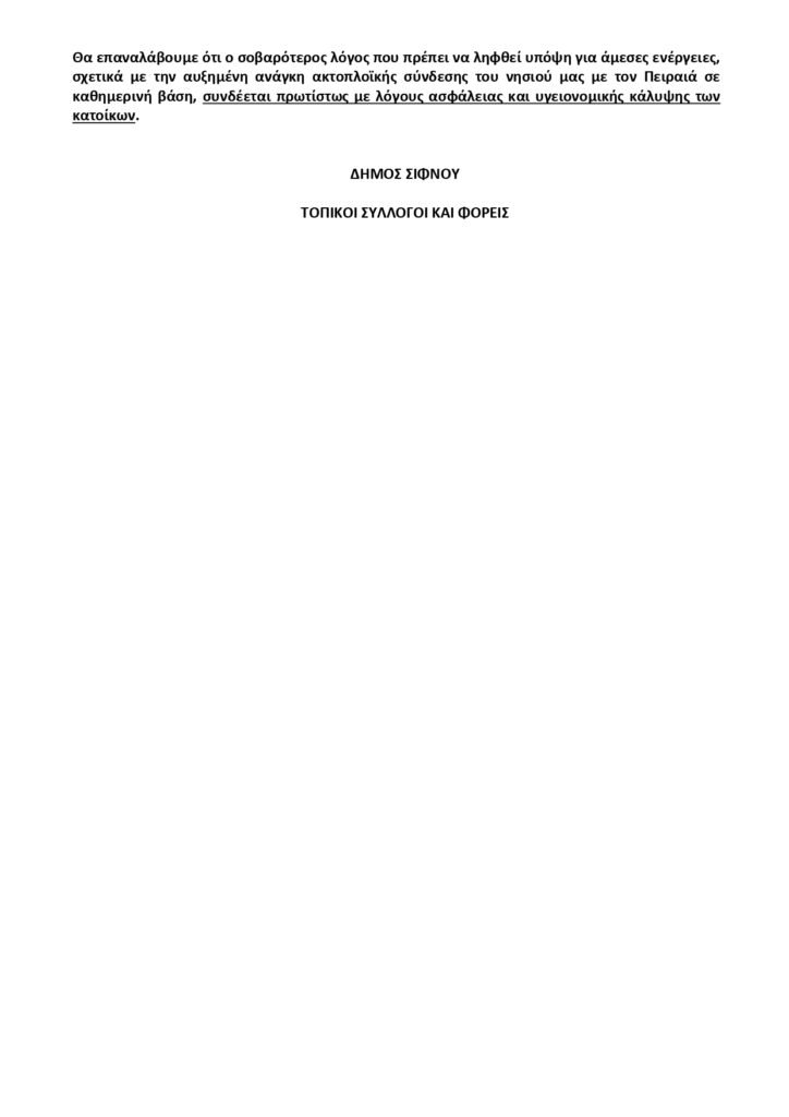 • Θα επαναλάβουμε ότι ο σοβαρότερος λόγος που πρέπει να ληφθεί υπόψη για άμεσες ενέργειες, σχετικά με την αυξημένη ανάγκη ακτοπλοϊκής σύνδεσης του νησιού μας με τον Πειραιά σε καθημερινή βάση, συνδέεται με λόγους ασφάλειας και υγειονομικής κάλυψης των κατοίκων.
