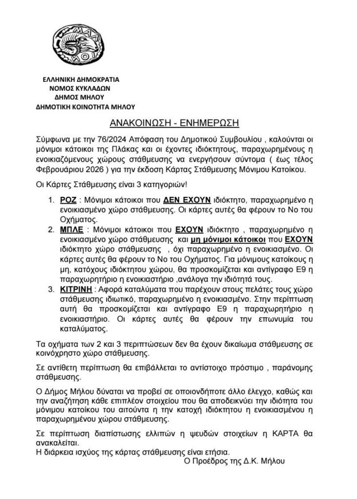 Δήμος Μήλου: Σχετικά με ιδιόκτητους, παραχωρημένους ή ενοικιαζόμενους χώρους στάθμευσης