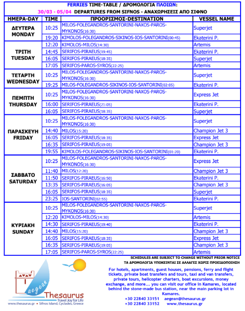 Αναχωρήσεις πλοίων και ελικοπτέρων από Σίφνο από 30/3 μέχρι 5/4/26