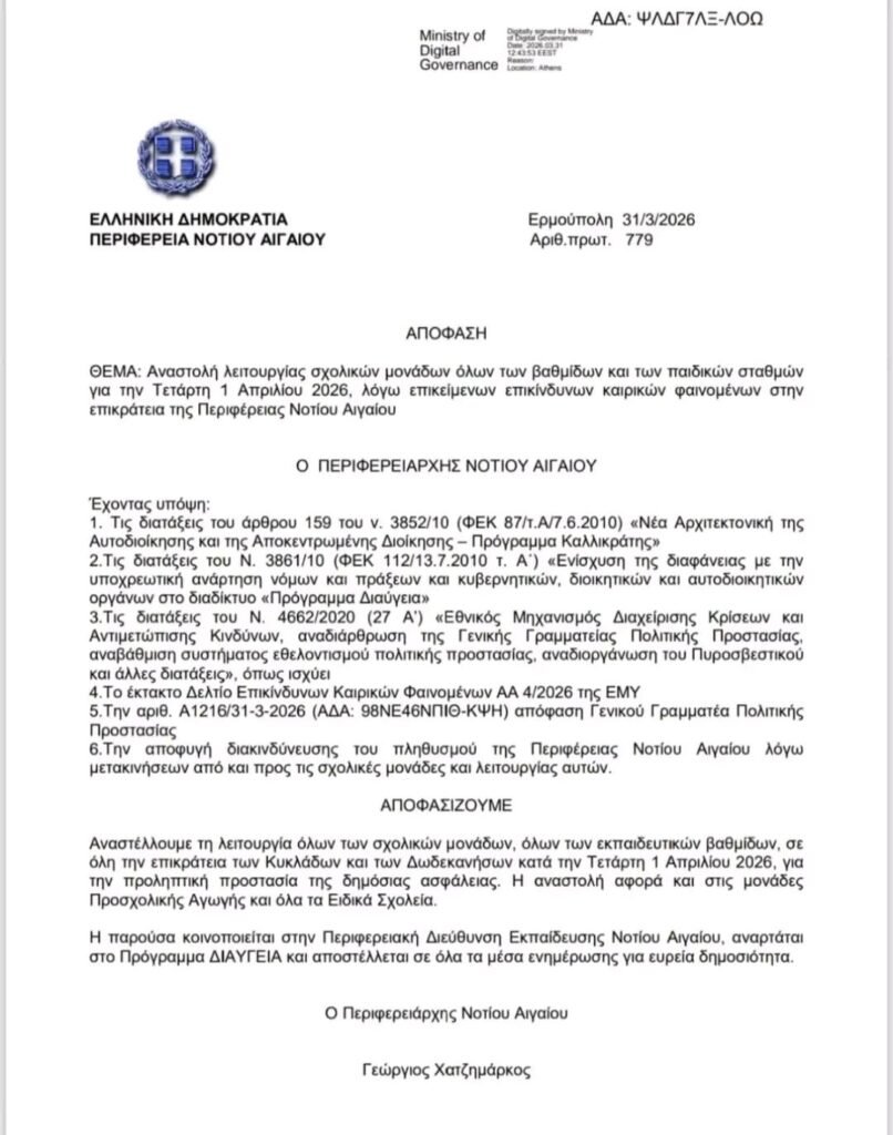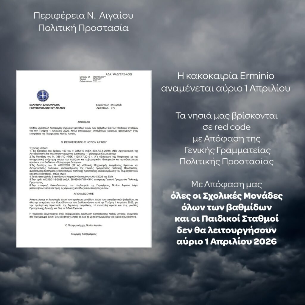 Κλειστά αύριο 1/4/26 όλα τα σχολεία στο Νότιο Αιγαίο λόγω καιρού.Απόφαση Περιφερειάρχη